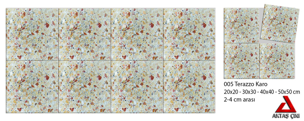 Terrazo Karo Karacaören modeli renkli agregalar ile imal edilmiş terrazo zemin ürünümüzdür.